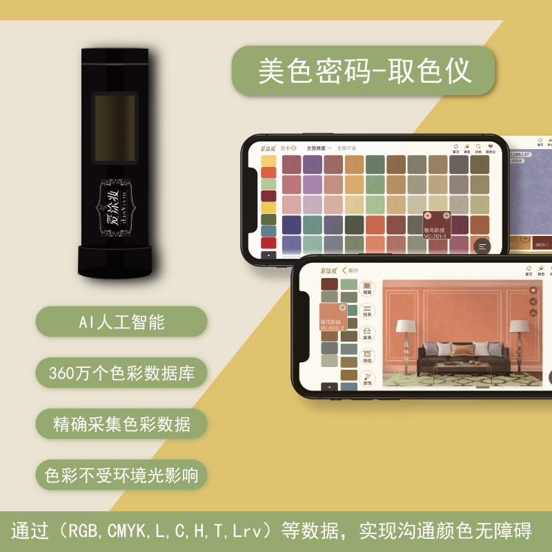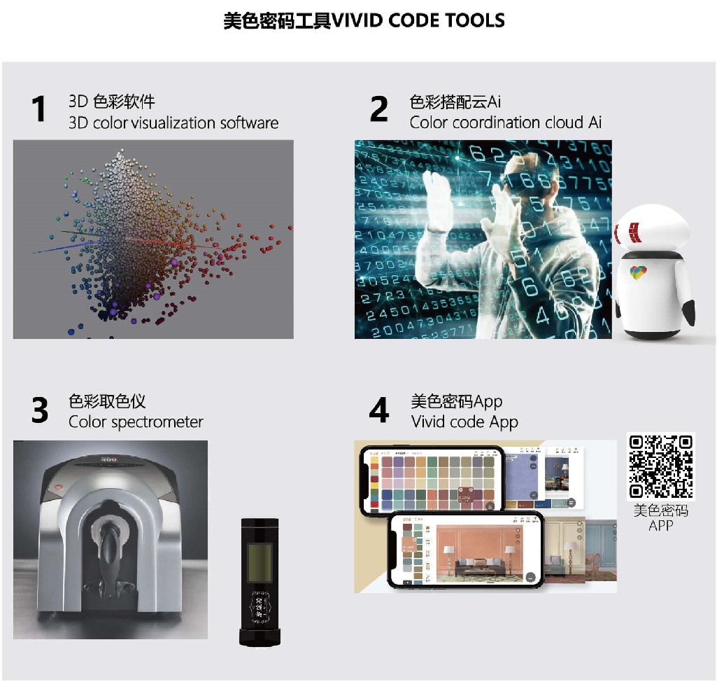 美色密码通过人眼看颜色的方式编辑色彩,成为描述颜色的标准语言,是设计界的一次重大革命。美色密码色彩研究中心拥有精确的色彩测量仪器、配色工具、以及人工智能科技,可以帮助设计师快速选色、自信配色,同时也是设计师与不同行业的材料商沟通色彩的便捷工具,使全案色彩设计更加方便、快捷。
