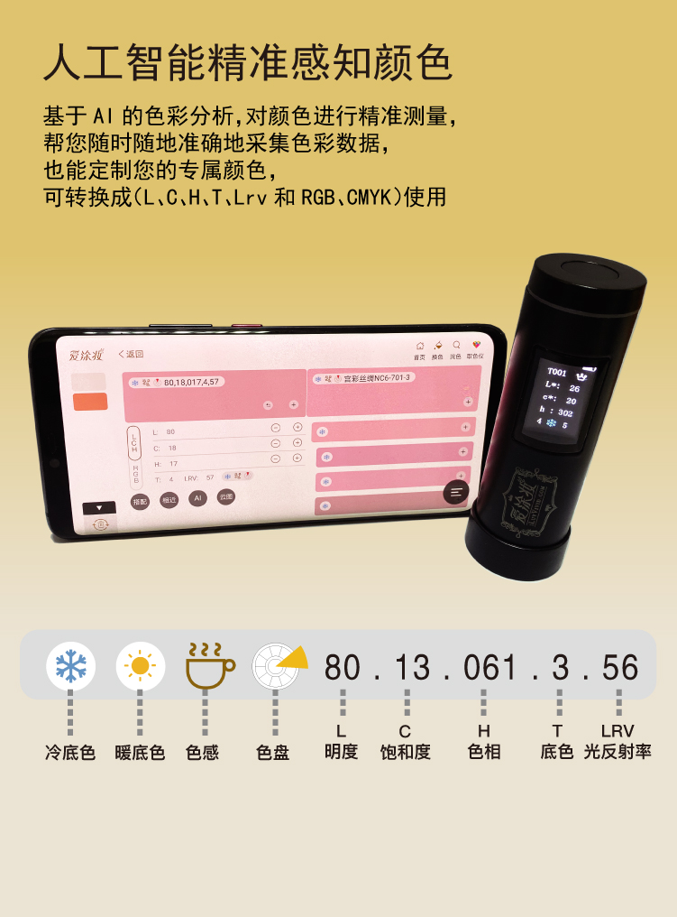 美色密码通过人体生理(眼睛、大脑)对颜色的理解方式来编译色彩,将颜色用明度、饱和度、色相、底色和光反射这10位数据来表示。是描述颜色的标准语言,并且可以通过它沟通颜色,找到它们之间的搭配。