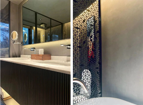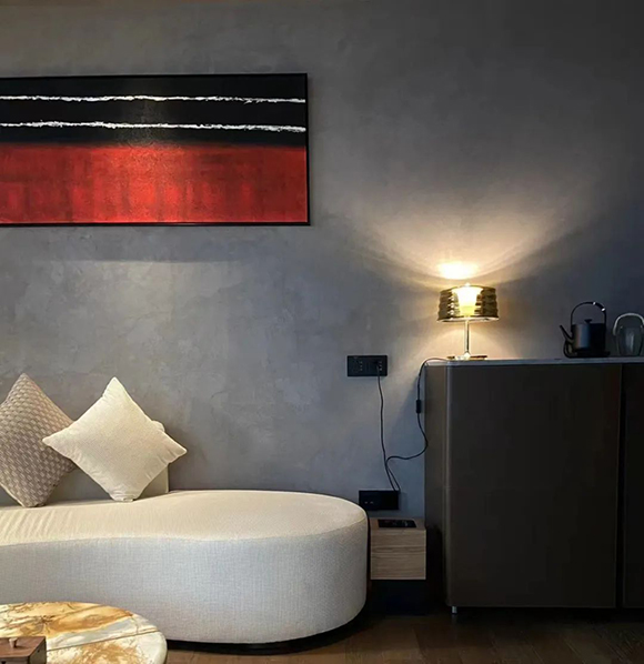 客房内家具多采用天然岩板与北美胡桃木,墙面是爱涂妆纳帕皮彩系列