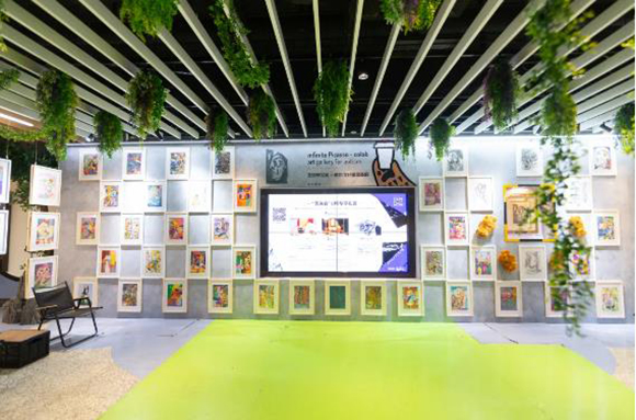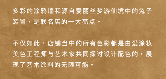 在联名店铺的墙面上,孩子们的作品与爱涂妆美色工程师共同打造