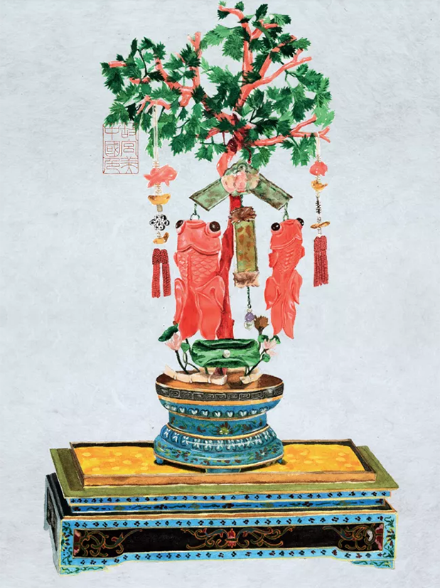 比如用在故宫宝物珊瑚翡翠吉庆有余盆景中的“海天霞”,