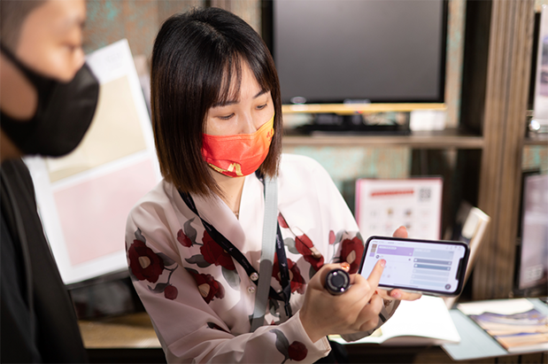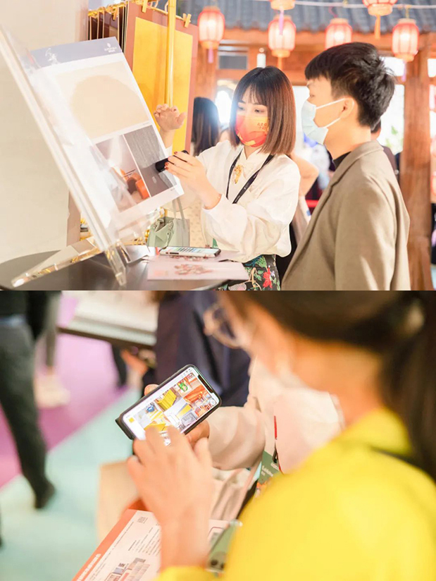 ▸ 身着中国传统服饰的美色工程师在展台为观众讲解