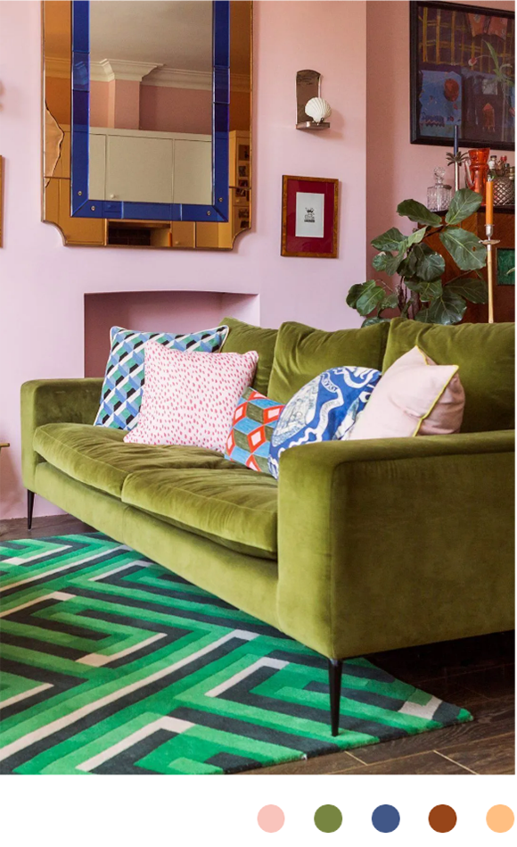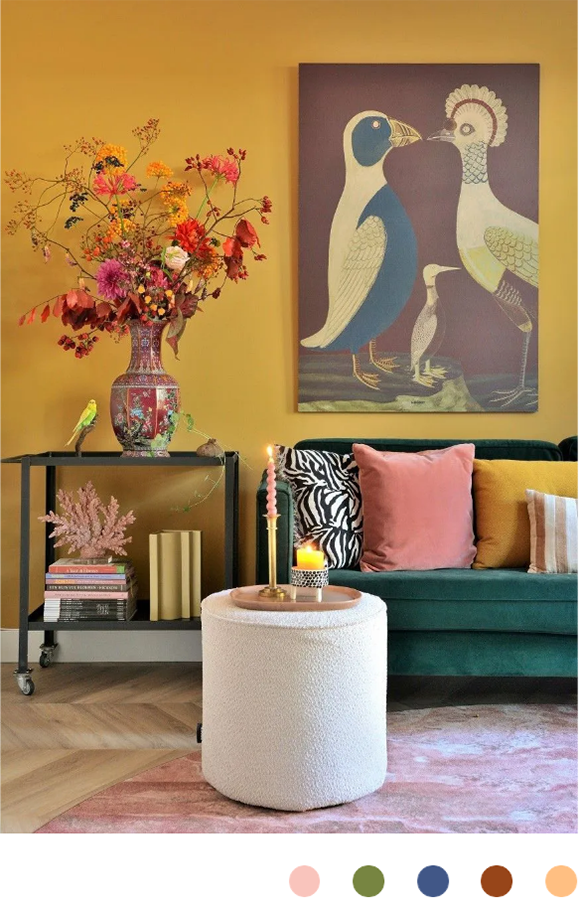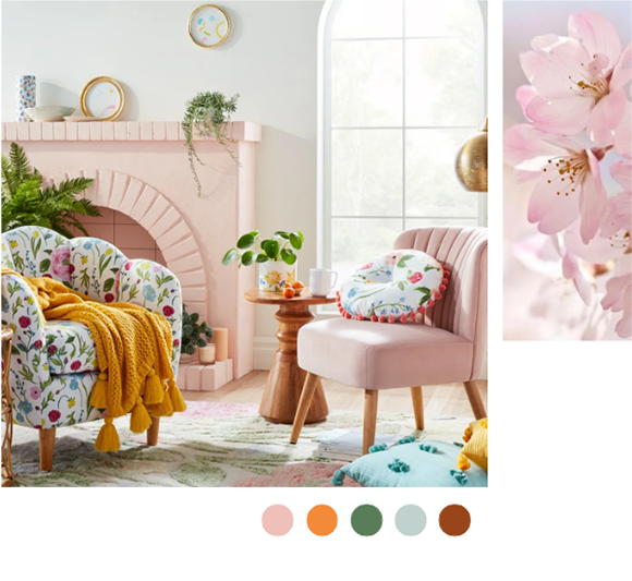 如果想在家居空间的配色中有所突破,不妨大胆尝试一下樱花色 + 杏黄色