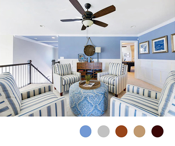 灰色作为一种中性色彩,可以很好地平衡碧蓝色的耀眼,带来优雅而稳重