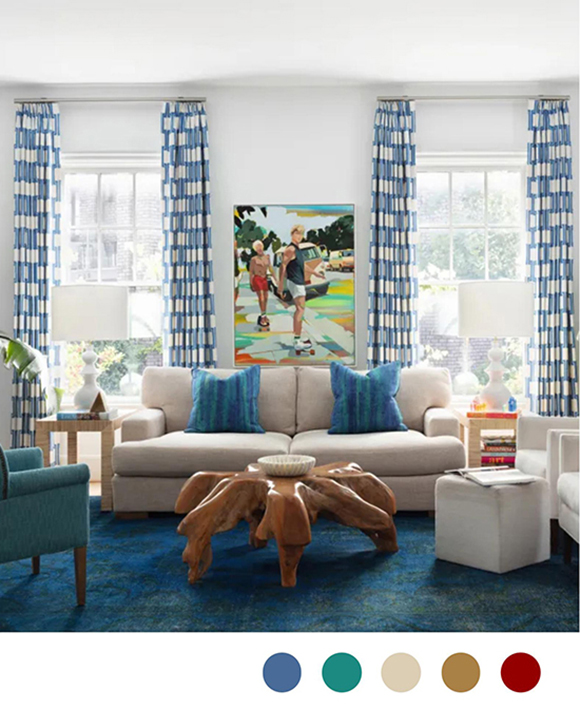 色的墙面、窗帘、沙发等,与碧蓝色的地毯、抱枕等小饰品相互衬托,让