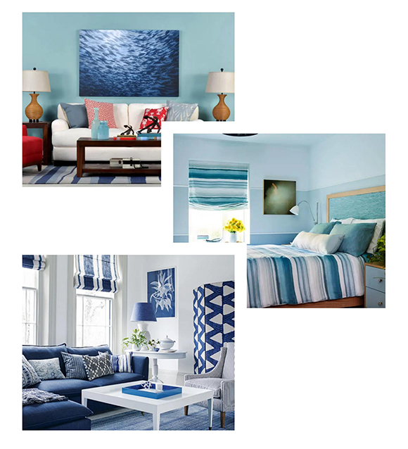 蓝色的家居环境中,摆放绿色的植物、靠垫或者壁画 ,为家居空间注入清