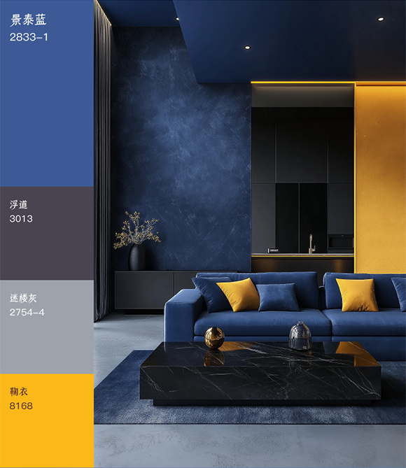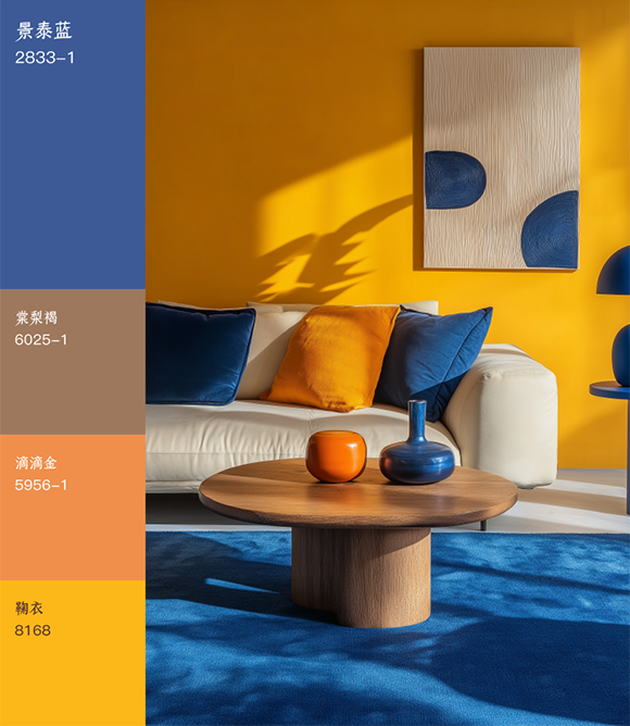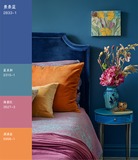 例如,将景泰蓝色床头与橘色系、粉色系床品搭配