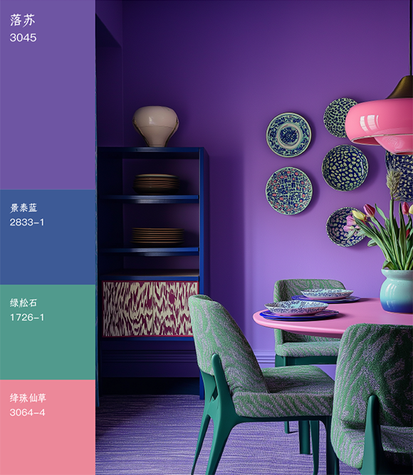 景泰蓝色装饰盘、粉色吊灯、绿色纹理椅子